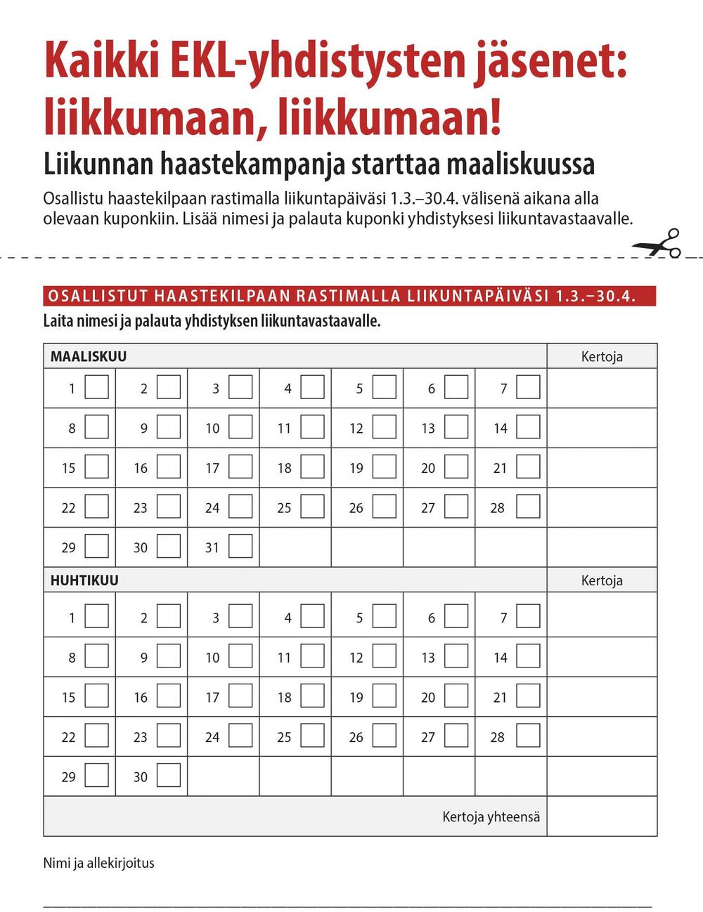 Päivittäisen liikuntasuorituksen tulee kestää yhtäjaksoisesti vähintään 30 minuuttia. Kampanjaan hyväksytään vain yksi suoritus/ päivä/ hlö. Näin ollen yksittäisen jäsenen suoritusten enimmäismäärä kahden kuukauden ajalta voi olla korkeintaan 61.