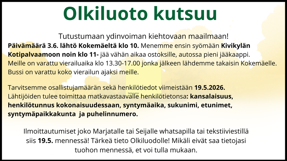Voi laittaa tiedot minulle whatsapilla tai tekstiviestillä 0449922290 ja sama juttu kuin Olkiluoto-matkallekin,
